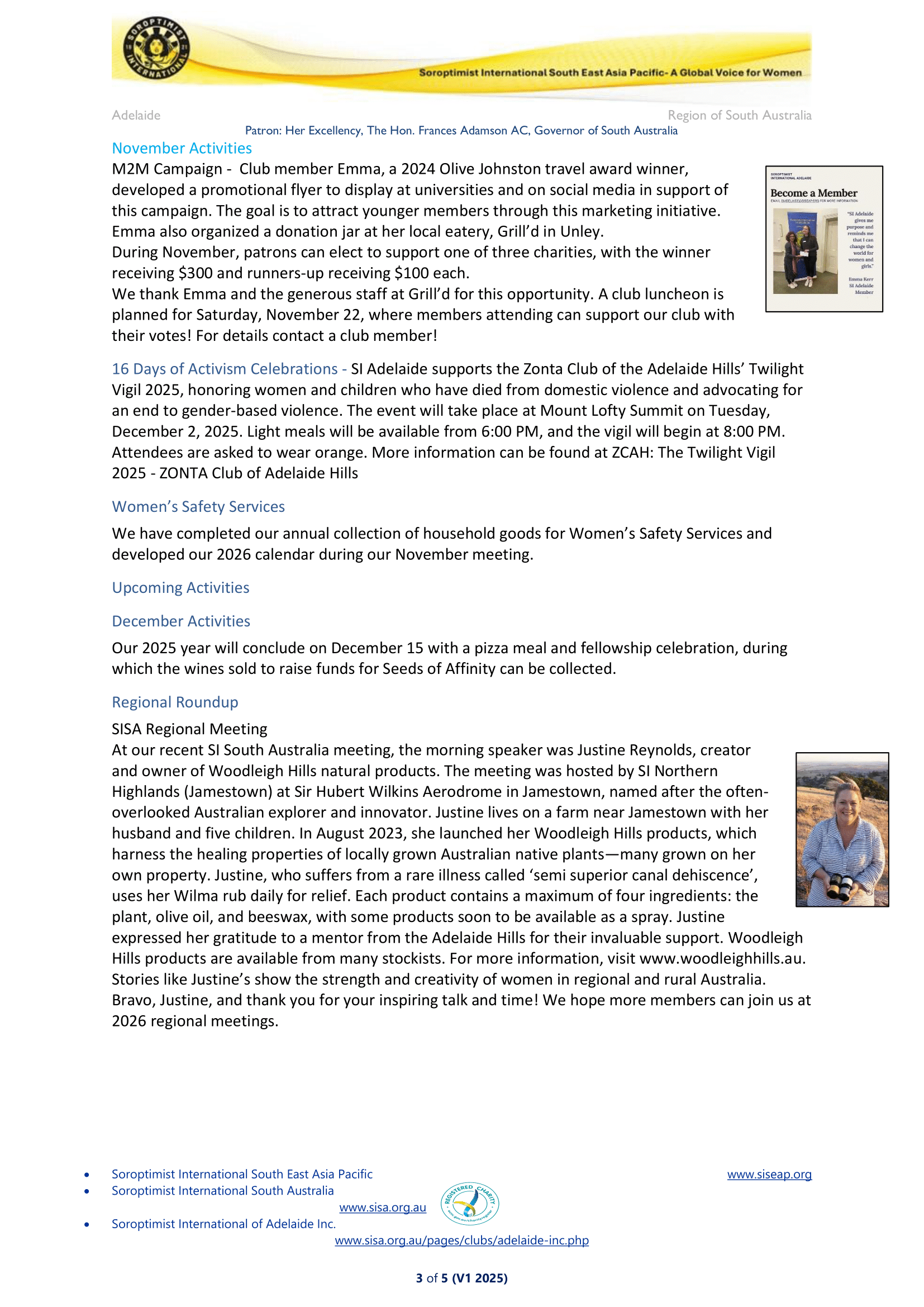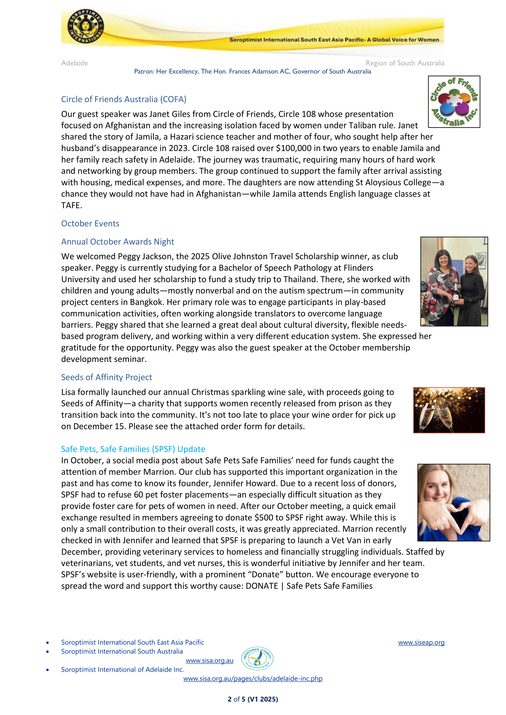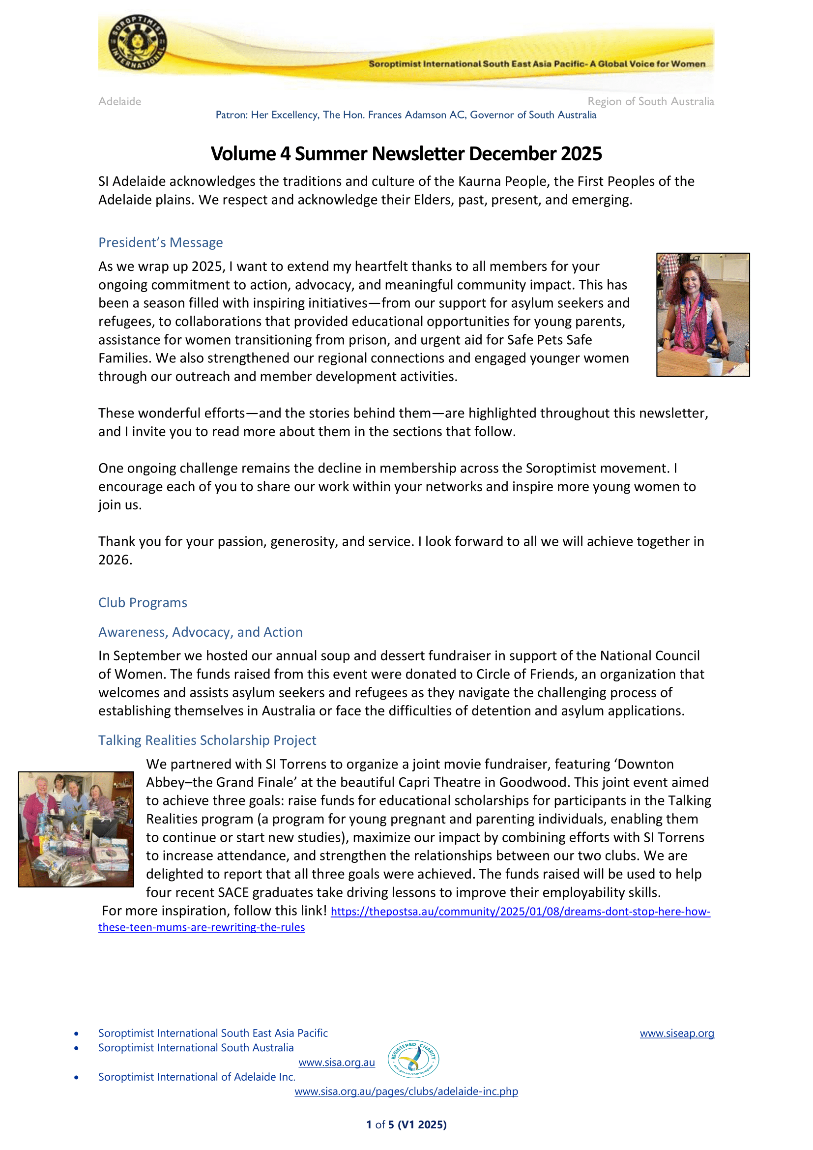In this edition, SI Adelaide showcases a year rich with advocacy, compassion, and community impact. From supporting asylum seekers and refugees to empowering young parents, assisting women transitioning from prison, and responding quickly to urgent community needs, the club’s commitment to action shines through every page. You’ll also find inspiring program highlights, member achievements, collaborative fundraisers, and upcoming events that continue strengthening connections across the region. Packed with purpose, heart, and hope, this newsletter beautifully reflects how SI Adelaide is creating meaningful change for women, girls, and the wider community.