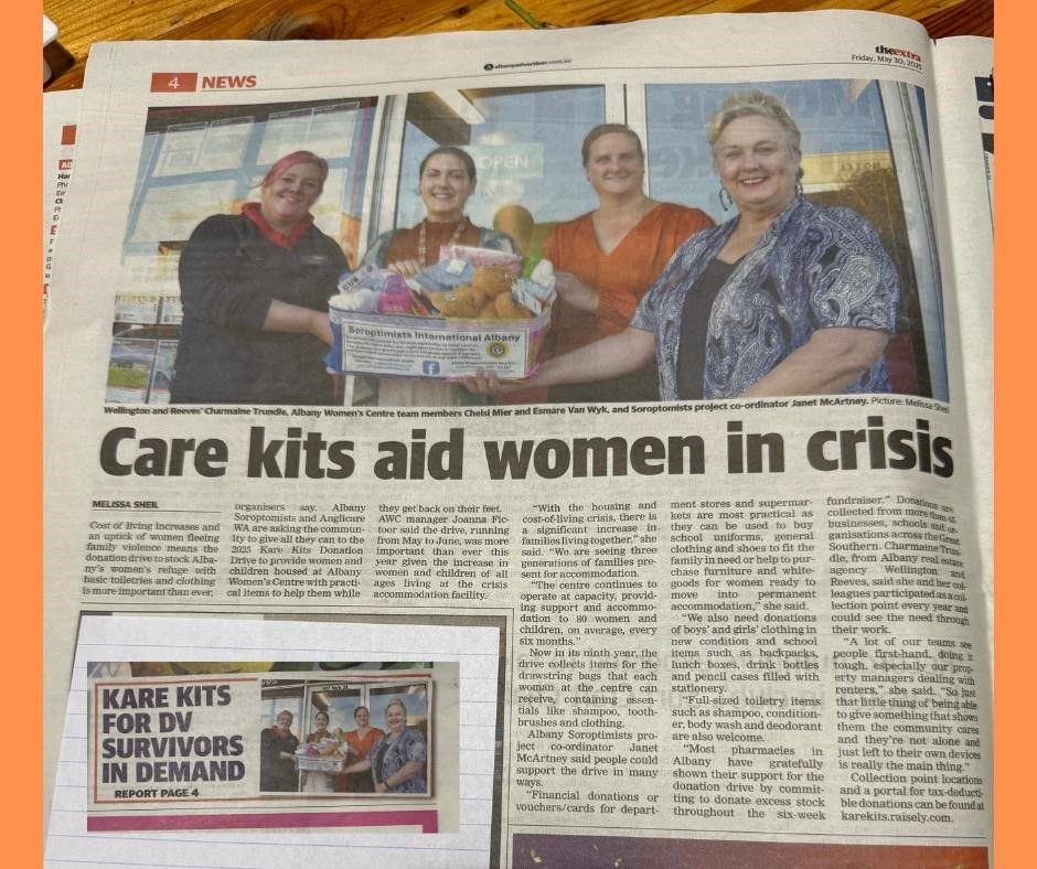 AWC staff worked with SI members to assemble the kits and AWC staff took all the kits as well as the all the extra items donated. These included tissues, children's and women's clothing, travel toiletry kits, bath packs, facial care masks, hand/nail/foot care items, hair ties, lip balm, make up, baby items, blankets, shower caps and commercial pamper packs were among the donation. SI Albany members distributed the boxes and collected when full and assembled the kits at an SI members home. AWCKK, SI Albany and Anglicare Facebook pages continue to engage and advertise the drive, with posters promoting the participating entities involvement at box drop off and collection. These Facebook pages also disseminate information about prevention of family violence and helplines. Regularly throughout the year people contact the page to give donations. Soroptimists will pick up and deliver to Anglicare or the AWC. Those items not needed by the Albany Women's Centre were donated to Days for Girls (travel size soap), and Shalom House shelter for homeless men (men's toiletries and clothes). This year $1310 was raised through cash donation and direct bank transfer to the Kare Kits account held by Anglicare. $300 worth of local store vouchers was donated.